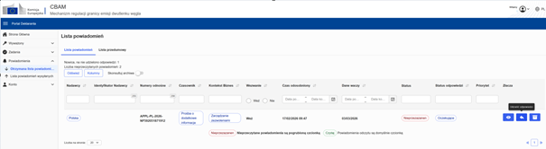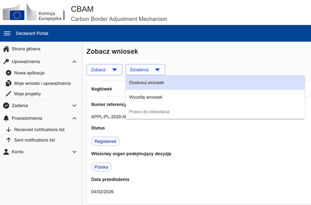 Wysłany wniosek znajdziesz w unijnym portalu zgłaszającego CBAM w zakładce Moje wnioski i upoważnienia.
