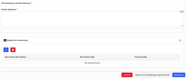 W polu „Przedstawiony punkt widzenia” możesz jeszcze uzupełnić dane, których nie przekazałeś na etapie wcześniejszego rozpatrywania wniosku. Wyraź swoją opinię na temat planowanej decyzji organu. Możesz również załączyć dodatkowe informacje w załącznikach klikając w niebieski „+”.