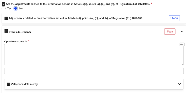 - Jeśli zaznaczysz opcję „TAK” kliknij przycisk „Utwórz” w polu „Dostosowania dotyczące informacji określonych w art. 5 ust. 5 lit. a), c) i h) rozporządzenia (UE) 2023/956” . Następnie uzupełnij i skoryguj wymagane dane.